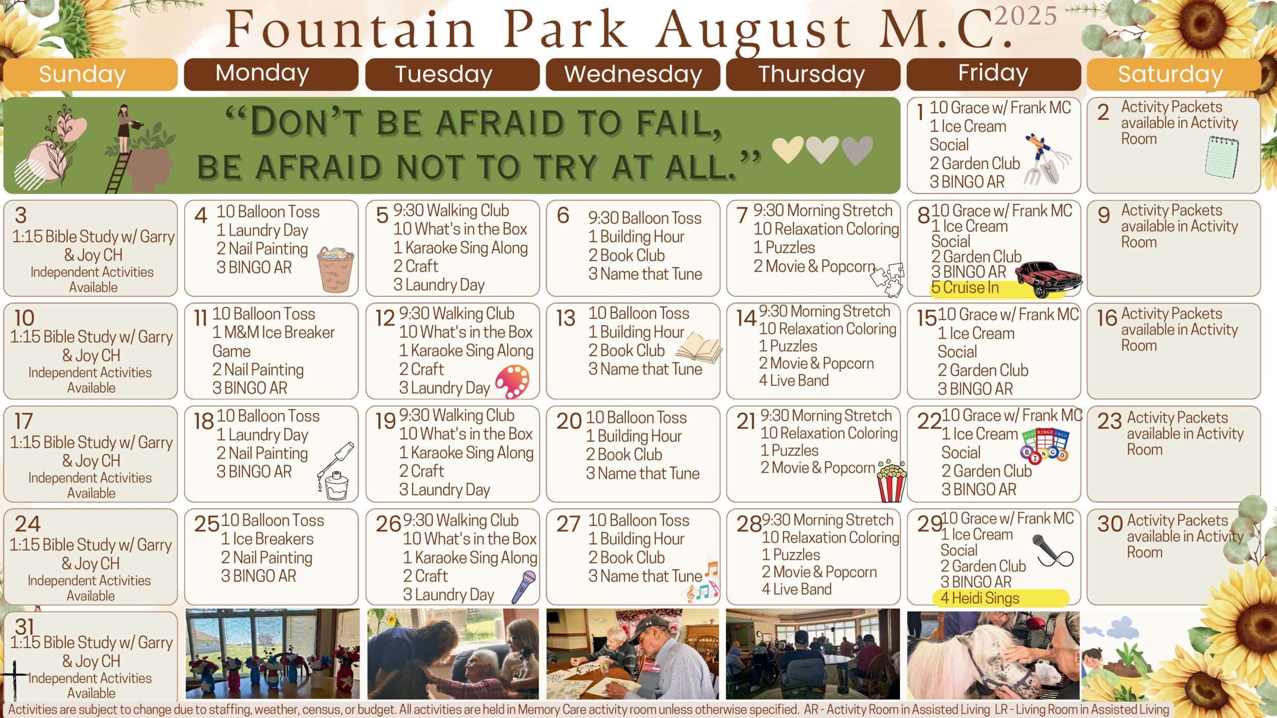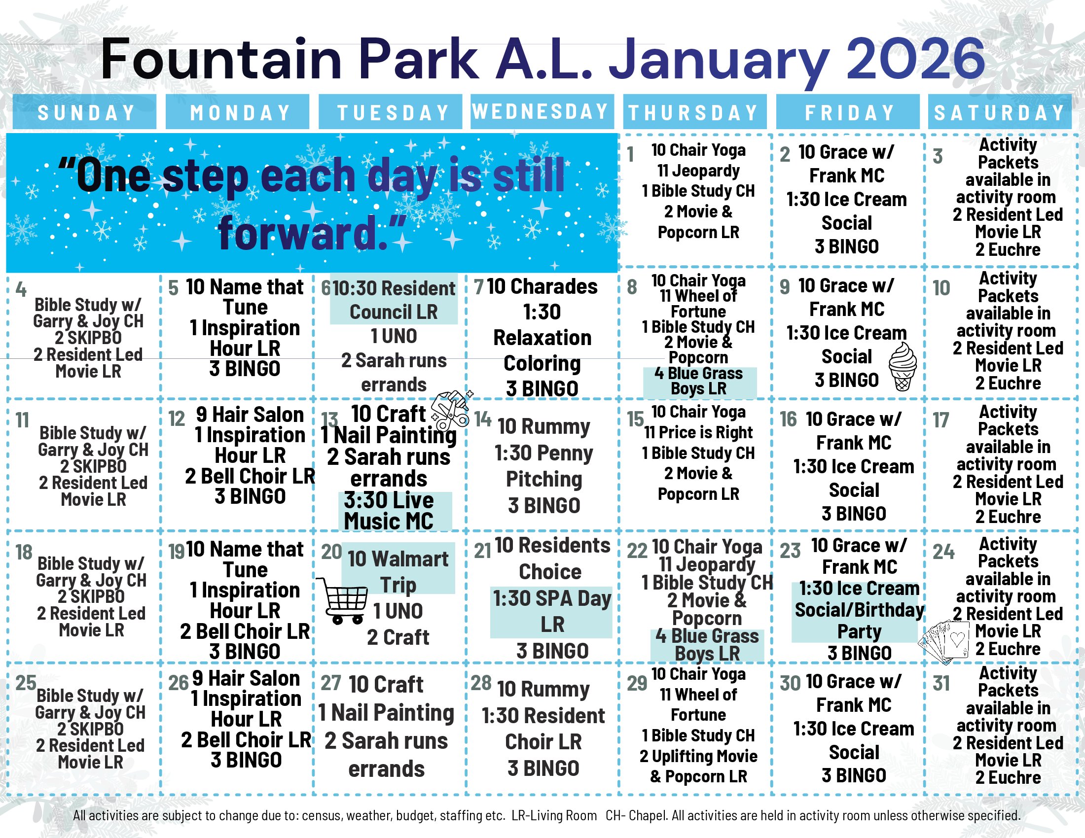 The Church services, Entertainment, and activities available are great. This allows and encourages the residents to interact and feel like a community. This is good for both there mental and physical health. I recommend Fountain Park to anyone needing to place their family member in a facility as a short term or long term facility.”- Janet Six